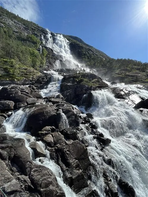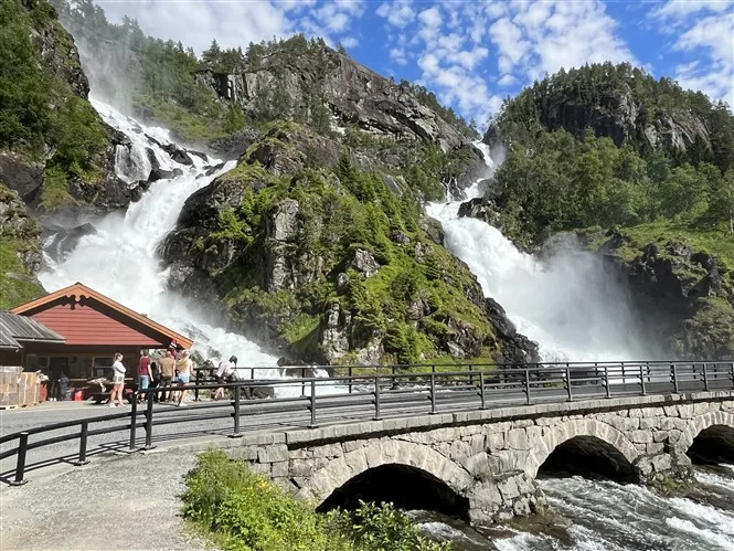 Ne ką mažiau įspūdingas dvigubasis Latefossen, kuris irgi tiesiog šalia kelio.
