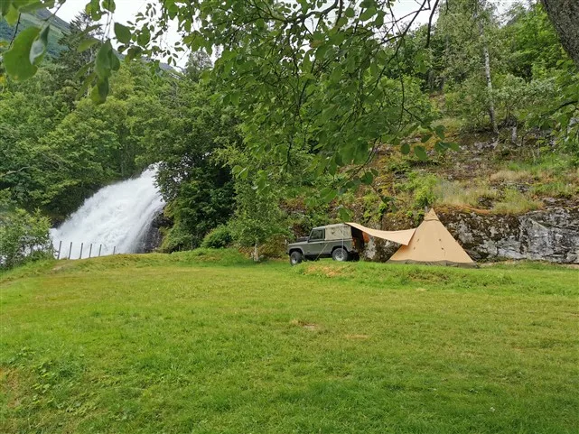 Įsikuriame kempinge praktiškai prie pat krioklio, kur labiau jau ribotas elektros kiekis. Turime savo, bet naktį žada +7. Kaip ir šilumos norėtusi, nes lietus nepaleidžia.